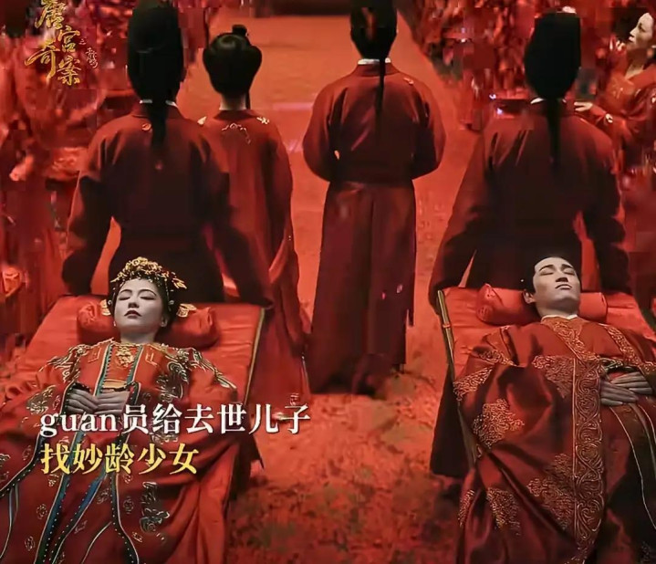 大红的嫁衣、大红的灵堂、闭着眼睛已经“死去”的男女,这一幕,看的人鸡皮疙瘩都起来了