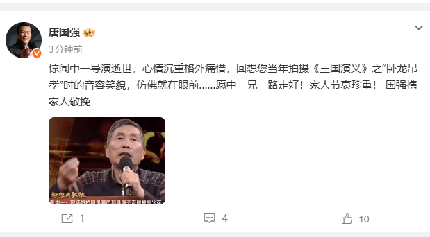 2月10日,唐国强发文悼念张中一:惊闻中一导演逝世,心情沉重格外痛惜,回想您当年拍摄《三国演义》之“卧龙吊孝”时的音容笑貌,仿佛就在眼前……愿中一兄一路走好!家人节哀珍重!国强携家人敬挽。