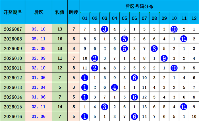 上期后区开出奖号01 06,为奇偶组合,近10期奇偶比11:9,奇号蓝球出号较热;预计本期偶偶组合出现,本期推荐06 08。