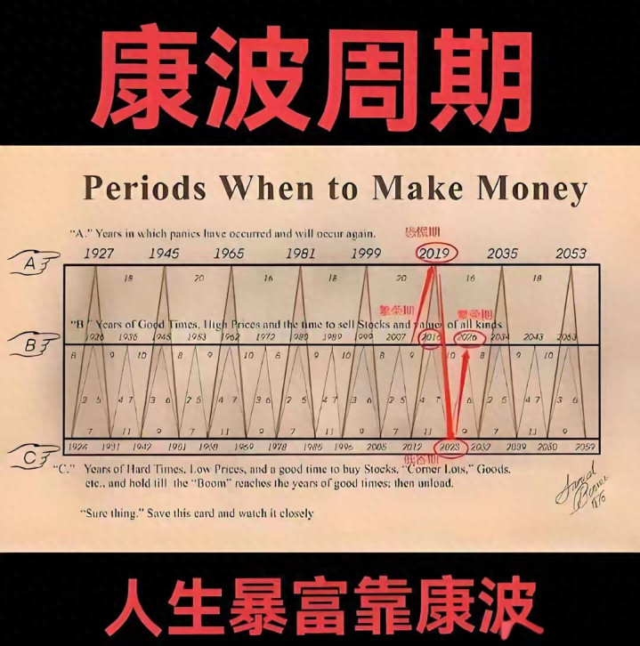 其实普通人一生能遇上三次康波财富机遇,2001-2015年的买房炒股红利已经过去,2016-2025年的资产抄底期也快收尾,而2026年就是关键拐点——第五个康波周期的萧条期结束,回升期正式开启,这是我们眼下能抓住的最好机会。